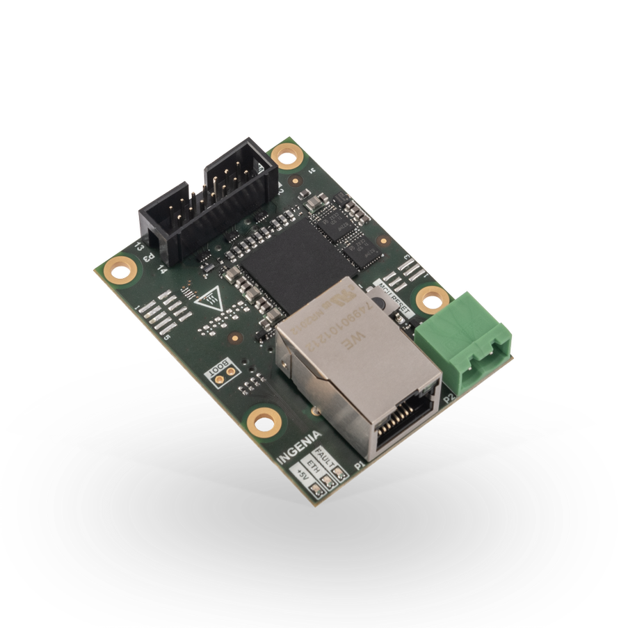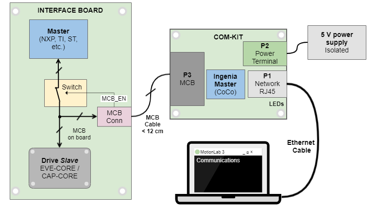 The MCB commissioning kit (COM-KIT) is a communications bridge between an Ingenia Motion Control Bus (MCB) based drive such as Capitan Core, or Everest Core, and an Ethernet port. It allows debugging, tuning, or commissioning servo drives using Ingenia MotionLab 3.