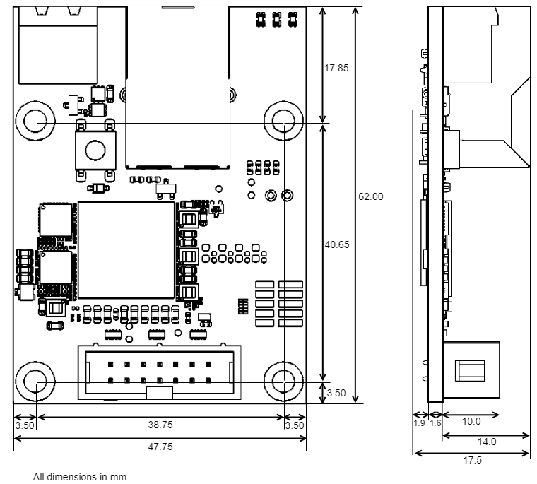 Dimensions | 62.0 mm x 47.75 mm x 17.5 mm Tolerances ± 0.1 mm. Dimensions do not include mating connectors |