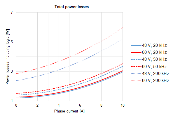 Following figure show the total power losses at different operating points. This includes logic supply which is an important contributor at low loads. As can be seen, lower PWM frequency and voltage leads to lower power losses.