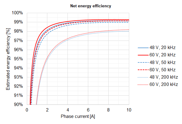 The following graph shows the net energy efficiency including logic for various operation points assuming 50ºC case temperature and maximum output power. Very high efficiencies > 99% can be achieved at 20 kHz PWM frequency.