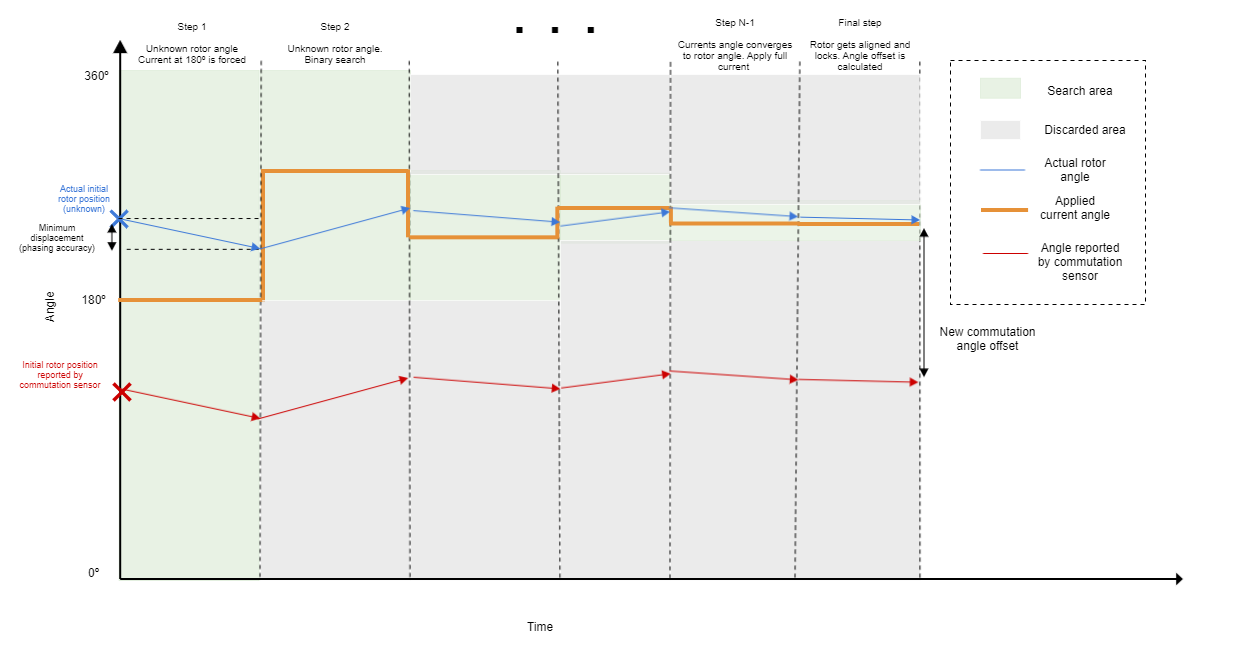 This alignment procedure is used to calculate the commutation sensor angle offset with the minimum possible movement. To do this, the driver forces a series movements in the motor in order to estimate the electrical angle of the rotor. Once this is known, the system can calculate and apply commutation angle offset so that the motor can be controlled correctly. This alignment procedure can be used with any type of sensor. The algorithm by which the forced alignment determines the rotor's angle is described below