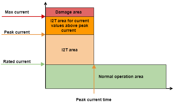 Current values that are higher than peak current but lower than max. current is allowed, however, the peak current time is automatically decreased to respect the I2T defined area. See the Drive protections section for further information.