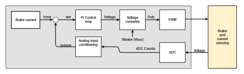 Current control mode is useful when the power supply of the brake is not stable and can variate during the operation, the readings from an external current sensor are used by the drive to calculate the required duty cycle to achieve a preset current. In this mode the current applied to the brake is controlled by means of a PI control loop.