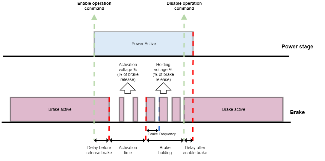 Indicates the delay in milliseconds between engaging the brake and deactivation of the power stage. - Activation brake time. Time duration in milliseconds of the brake activation stage. If set to 0, the holding stage is directly applied.
