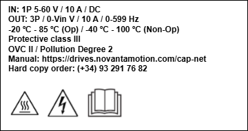 “WARNING – Risk of Electric Shock“. Capacitor discharge below 50 Vdc after 5 seconds.