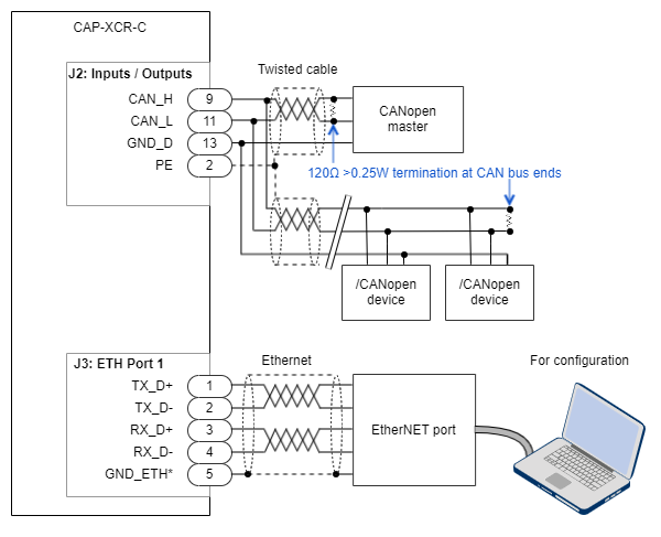 CAP-XCR-C | Not used. | EtherNET standard port (default address 192.168.2.22). | CANopen interface CAN_H and CAN_L. | |