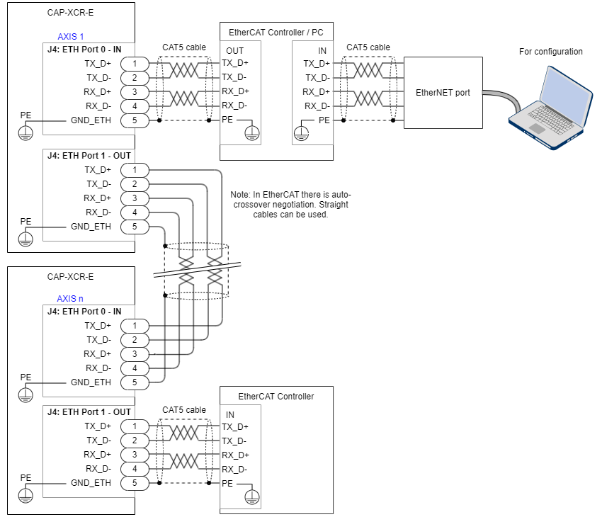 CAP-XCR-E | EtherCAT INPUT port 0. Motion Lab 3 can be accessed via Beckhoff Twincat tool from a PC. | EtherCAT OUTPUT port 1 | Not used. |