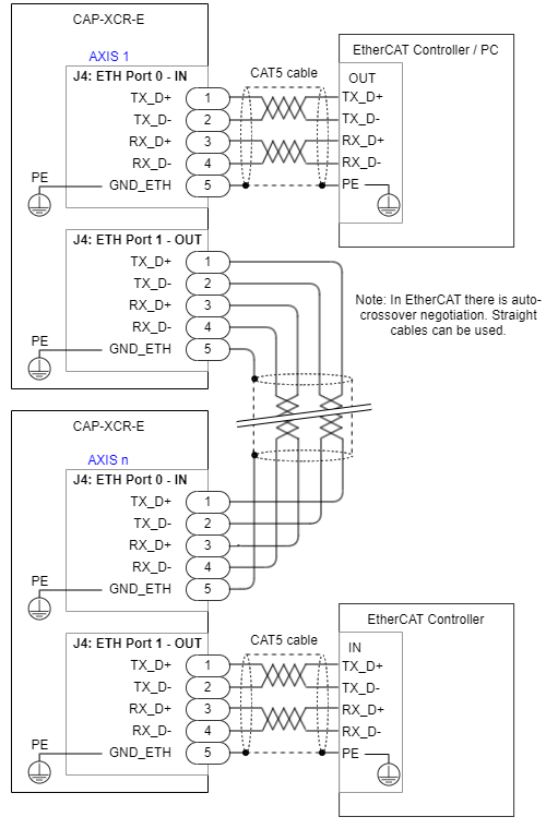 The next figure shows how to connect the Capitan XCR in an EtherCAT bus. It is recommended to follow the standard IEC 61918-2013 for best practices.
