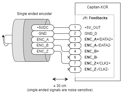 The wiring of a single-ended encoder to the Capitan XCR is shown next:
