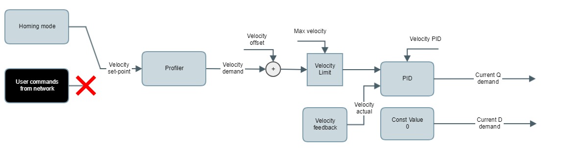 Homing movements are based on velocity mode with the profiler. When homing mode is enabled, user commands (target velocity) are ignored.