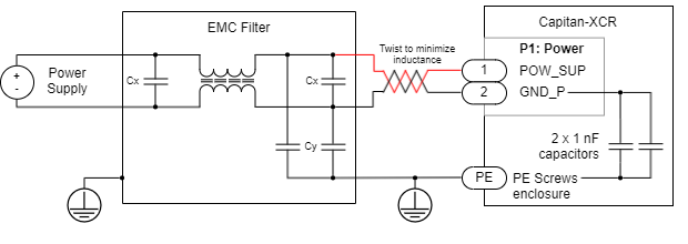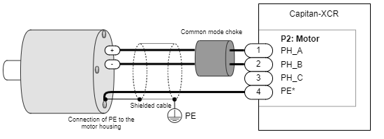 The connections are shown next, a good PE plane is strongly recommended. Please follow grounding recommendations. Note that the Capitan XCR includes 2 x 1 nF 2 kV capacitors between GND_P and PE (the drive aluminum enclosure).