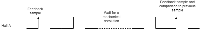 To detect counts per revolution of the selected feedback, an event is triggered on a specific transition of Hall A and is only triggered after as many repetitions as pair poles are specified. This event samples the readings of the feedback, and compares it to the previous event, except in the first event of all, where only the sample is taken. This first event can happen either at the start-up of the drive, or when changes of direction are detected in the halls feedback.