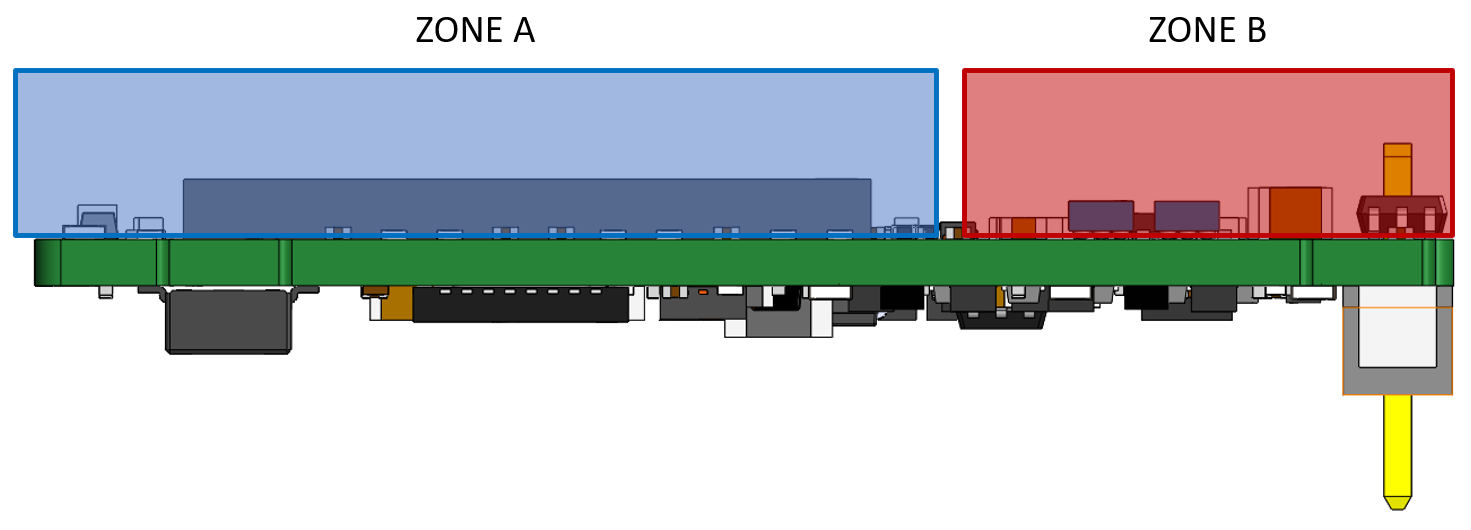 - Plug in the DEN-NET to a PCB by applying pressure ONLY to Zone A, avoiding any contact with Zone B.