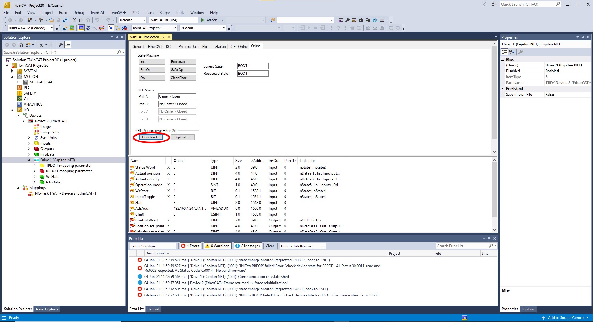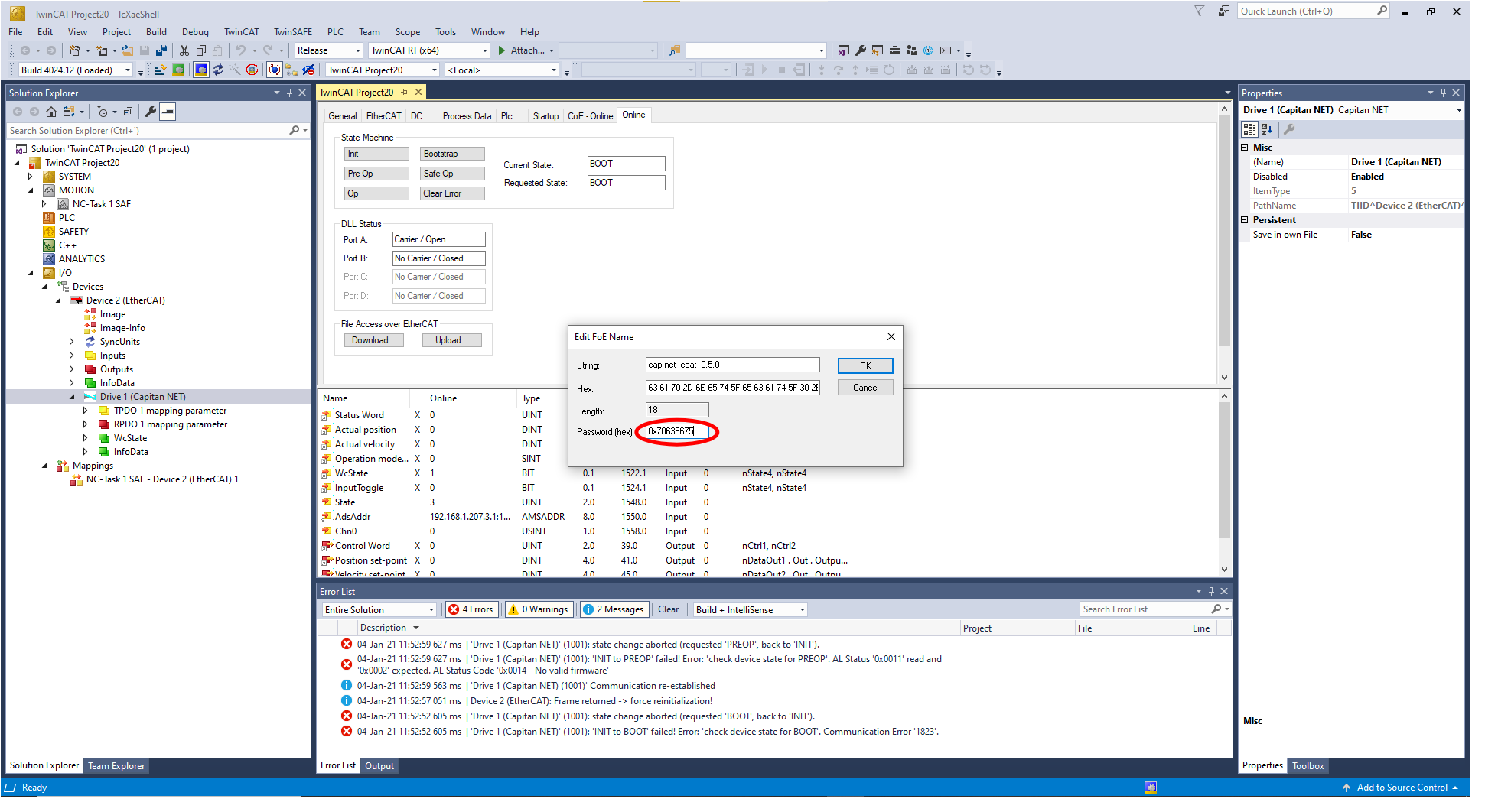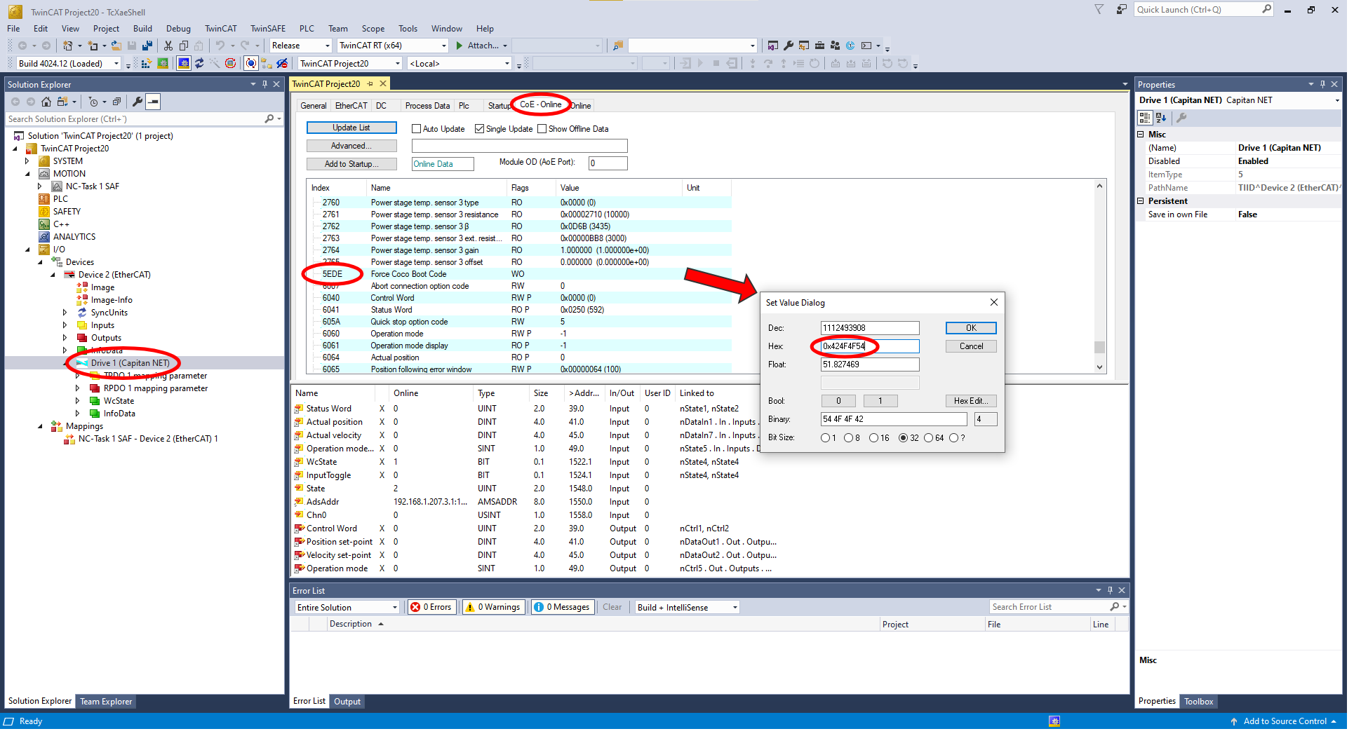 2.Open the CoE Online tab and search for register Boot Mode (Index 0x5EDE) and write the boot password 0x424F4F54.
