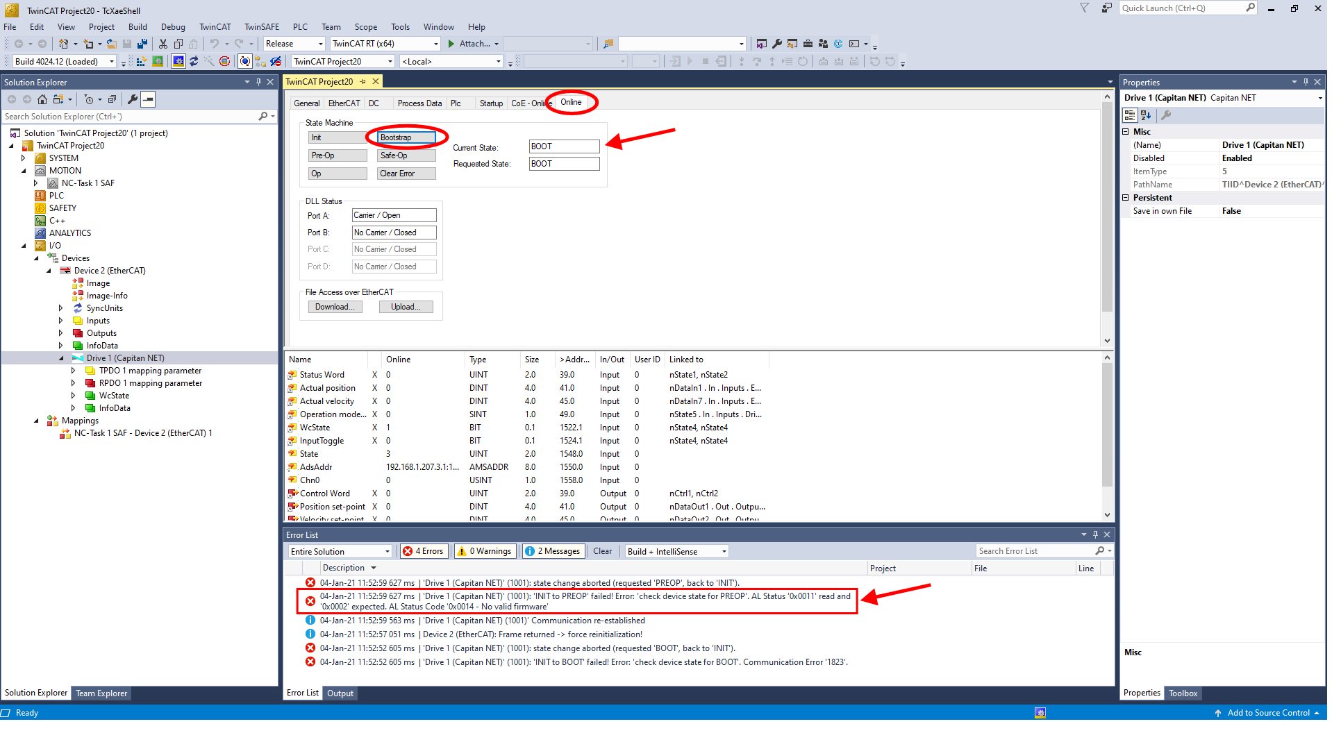 Move to Online tab and set the drive into bootstrap state. The drive will restart (few seconds) and the bootloader will boot up in ERR INIT state. A message of "no valid firmware" will be seen, this message notifies the entrance in bootloader mode.