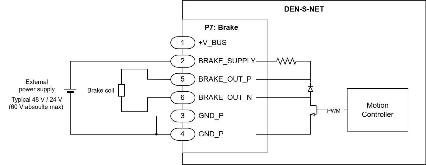 The next figure shows the connection with a single power supply. Note that it is possible to operate a 24 V brake with a 48 V power supply by configuring the maximum PWM duty cycle of the brake to 50%. In this case, configure it carefully before physically connecting the brake.