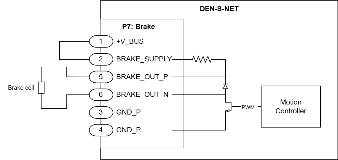 Electromechanical brakes are needed in critical applications where the disconnection of the motor or a lack of electric braking could be dangerous or harmful (i.e. falling suspended loads). Denali XCR Servo Drive includes a brake output on the P7. The brake output is an N-Channel MOSFET that can be PWM modulated to reduce effective brake voltage and thus power consumption when energized.