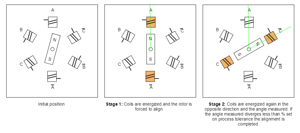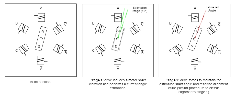 This method allows to detect the motor position in electrical angle terms by means of vibration. First the drive forces to vibrate the motor and performs an electrical angle estimation, this estimation has a tolerance of ±10 degrees approximatelly (it can variate depending on the motor design).After the actual angle is found, the drive forces the motor to go to this angle and then performs the phasing with this reading. This second stage of the alignment allows to increase the commutation precision to 1 or 2 degrees instead of the previous estimated tolerance.