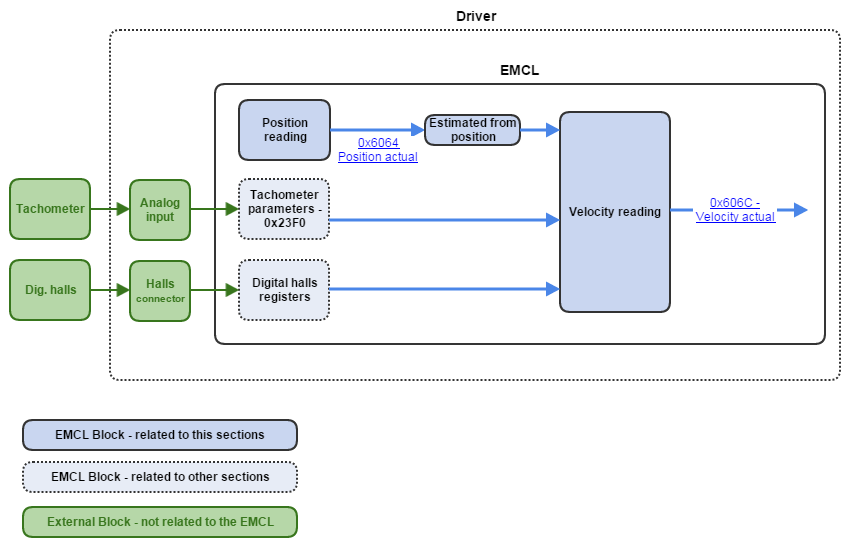 Velocity sensor could be measured directly with an external sensor, measured the time between two digital halls transitions or estimated from position sensor as shown below.