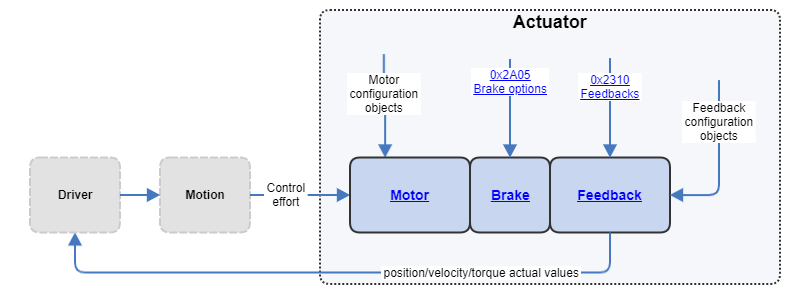 With the aim to offer maximum versatility for the development of motion control applications, EMCL supports a wide range of motors and feedbacks. You may click on any of the diagram boxes to learn more about each of the actuator elements.