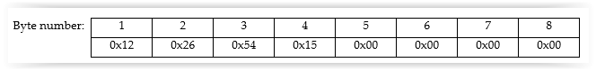 Data is stored and transmitted in little endian format, which mean that least significant byte of the data is placed in the first position. For example, the number 0x15542612 would be represented as: