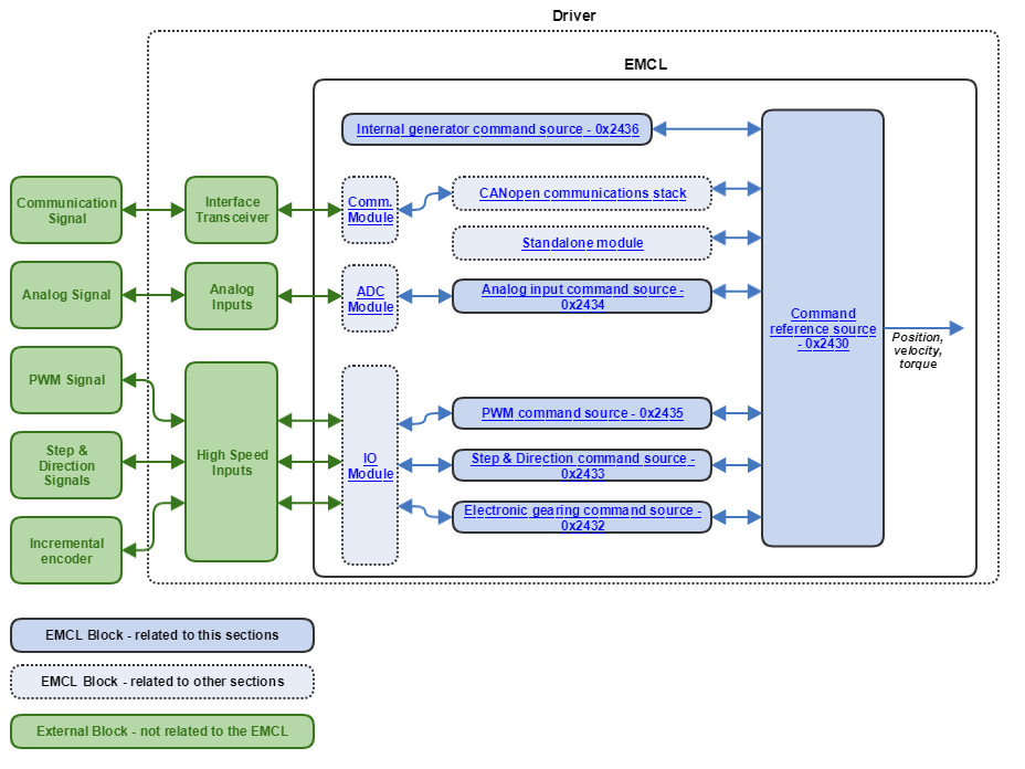 Command sources are mechanisms available to the user for setting the desired target value for a certain magnitude (position, velocity, torque, etc) that the driver is requested to reach. This information about the desired target value can be encoded in a multitude of ways: from a direct value request from the communication interface or a pulse count to an analog signal, a PWM signal or even the output of a quadrature incremental encoder. EMCL is able to handle all of those kinds of inputs to provide maximum flexibility and performance of the control system.