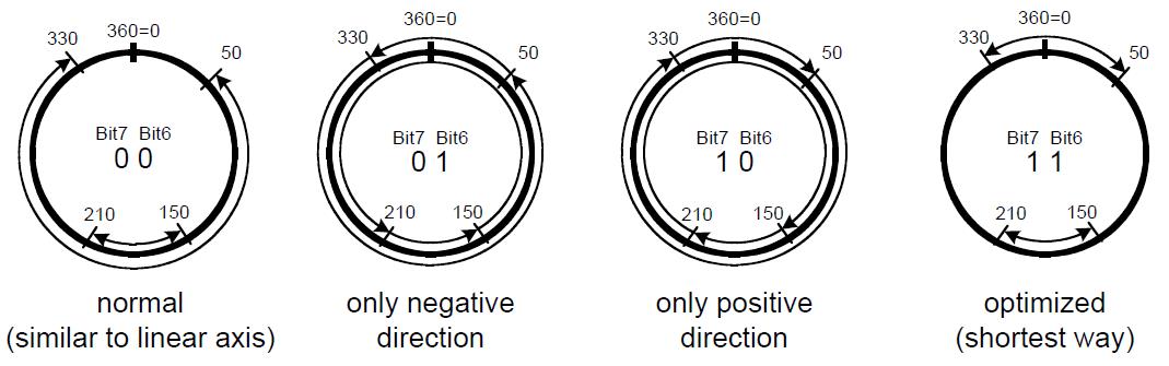 Following figure shows examples of the different modulo movement types, configured with bits 6 and 7 of the 0x60F2 - Positioning option code. In this example the min position range limit (0x607B, sub-index 0x01) is 0° and the max position range limit (0x607B, sub-index 0x02) is 360°.