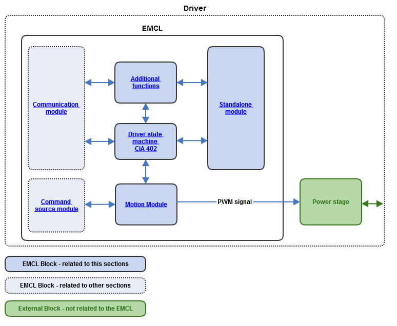 - Driver state machine: This module implements the motion controller state machine, as defined in the CiA402 document. Hence, it is responsible for enabling and disabling the motion module, the power stage, the brake, and other elements specified in the CiA402 standard.