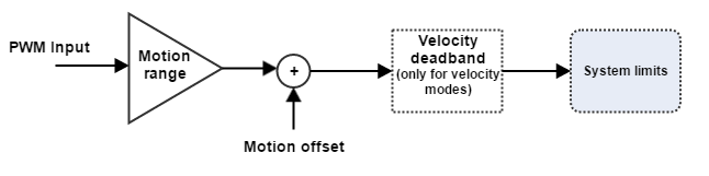 A PWM signal can be used as a command source for a motion application. For this signal to be useful to the control system, the magnitude value is decoded from the PWM signal. Thereafter, some linear transformations (scaling and offset) may be applied if desired, and afterwards system limits are applied. The potentially modified magnitude value is what is stored in the pertinent object.