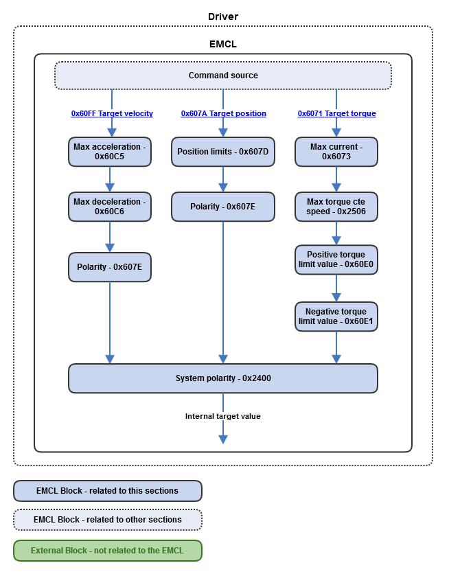 System limits prevent values for the target magnitude exceeding the allowed range to be even considered by the subsequent subsystems. They form a first line of defense of the motion controller and the actuator against target values that, to be reached, could potentially damage the drive or the actuator. Those values are inserted by the user during system configuration and define the range of operation of the motion controller.
