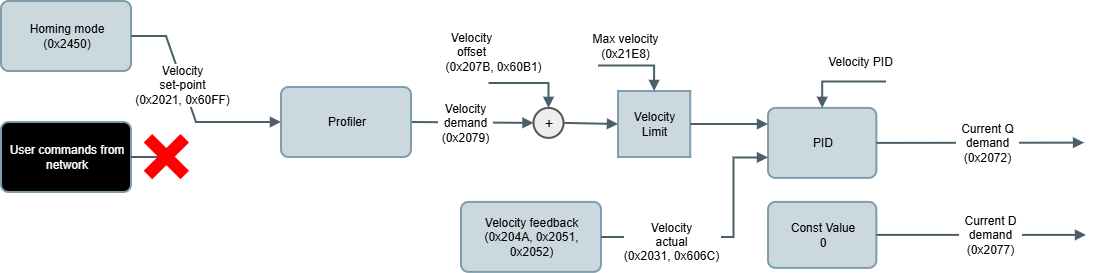 Homing movements are based on velocity mode with the profiler. When homing mode is enabled, user commands (target velocity) are ignored.