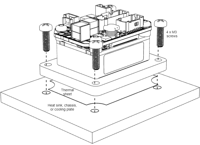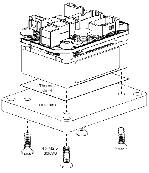 - Screw the 4 x M2.5 screws applying between 0.17 and 0.3 Nm of torque. Note that the M2.5 thread should be handled gently. The threads may penetrate the thermal interface material if the corners have not been trimmed.