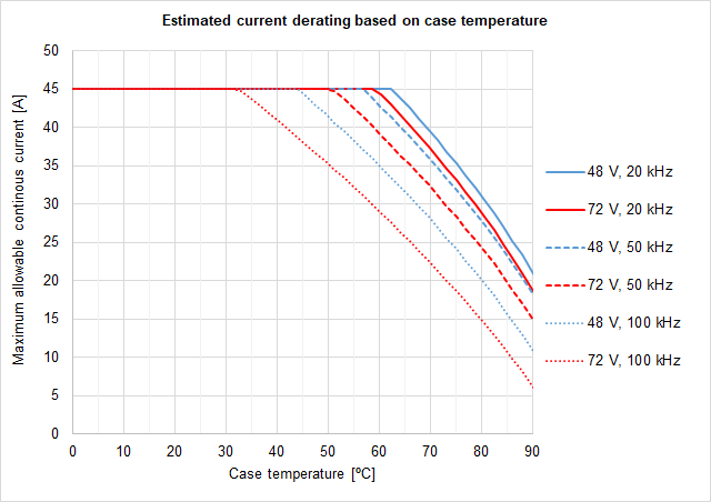 For example: If the application requires 30 A @ 72 V (20 kHz) the Tc will be 85 ºC
