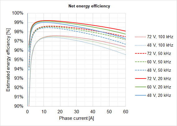 The following graph shows the net energy efficiency including logic for various operation points assuming 50ºC case temperature and maximum output power. Very high efficiencies > 99% can be achieved at 10 kHz or 20 kHz PWM frequencies.