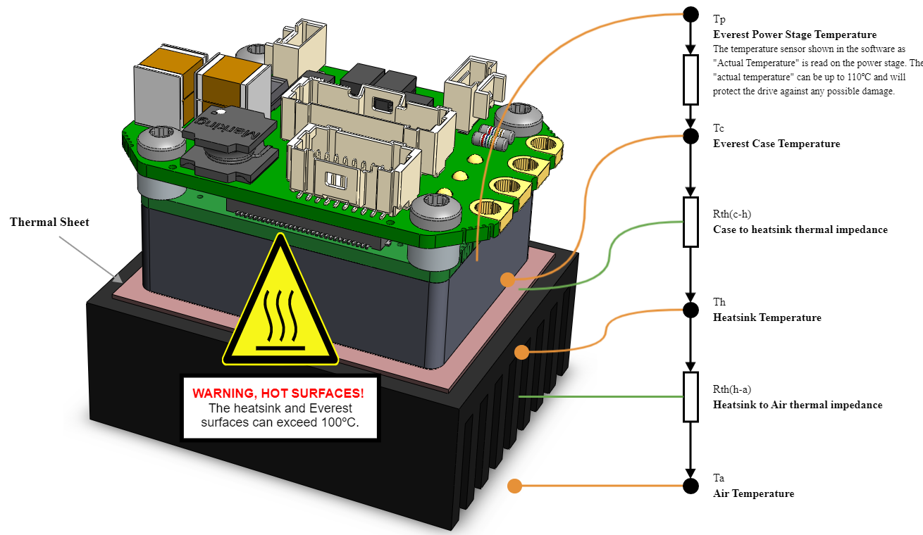 In some low-power applications, the Everest is NOT required to be mounted to any heatsink. In this case its thermal resistance from housing/case to ambient Rth(h-a) can be estimated between 8 K/W, to 12 K/W assuming 10 cm clearance to allow air convection at sea level. A good thermal design of the PCB providing big thermal ground planes on the contact areas can greatly increase the heat dissipation and reduce Rth(h-a) significantly.