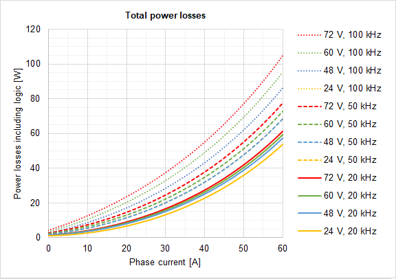 The following figure shows the total power losses at different operating points. This includes logic supply which is an important contributor at low loads. As can be seen, lower PWM frequency and voltage lead to lower power losses.