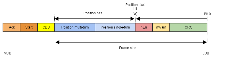 Where the ACK, Start, and CDS bits are automatically taken into account by the drive (when BiSS-C protocol is selected). The frame also contains active low error and warning bits, and a CRC field.