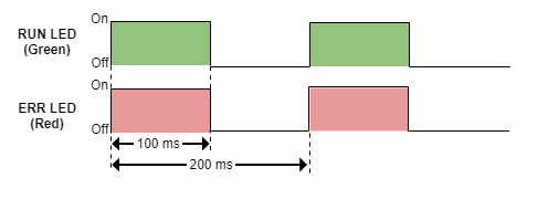 After clearing the flash memory (the valid application), CANopen bootloader will start running. This is indicated by means of Red and Green LED (CANopen error and run LEDs), both LEDs will blink at 5Hz frequency, as shown in the following diagram: