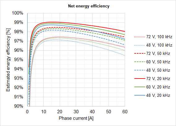 The following graph shows the net energy efficiency including logic for various operation points assuming 50ºC case temperature and maximum output power. Very high efficiencies > 99% can be achieved at 10 kHz or 20 kHz PWM frequencies.