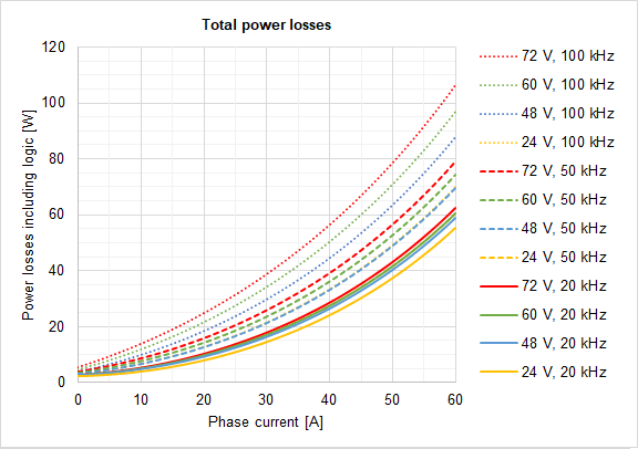 Following figure show the total power losses at different operating points. This includes logic supply which is an important contributor at low loads. As can be seen, lower PWM frequency and voltage leads to lower power losses.