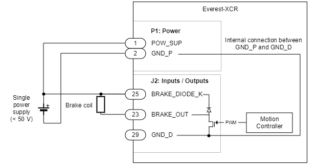 The next figure shows the connection with a single power supply (< 50V systems). Note that it is possible to operate a 24 V brake with a 48 V power supply by configuring the maximum PWM duty cycle of the brake to 50%. In this case, configure it carefully before physically connecting the brake.