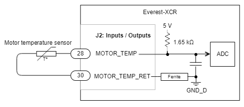 The Everest XCR motor safety system connector allows the connection of an external temperature sensor based on changes of resistance (PTC thermistor, bimetal, NTC, PT100, silicon temperature sensors) to measure the motor temperature. The motion controller includes linearization for various sensors so the motor temperature can be read directly. Connection of the 2 wire sensors is shown next: