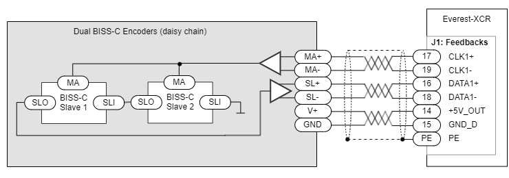 For dual daisy-chain BISS-C use the following connection. Dual BISS-C can be used for redundancy or to read the position of the rotor before and after a gearbox. Further details on this interface can be found here Primary Absolute Slave 2.