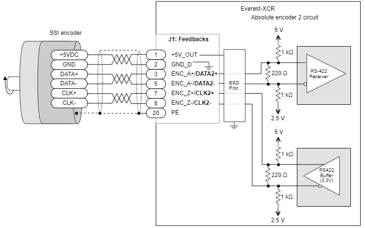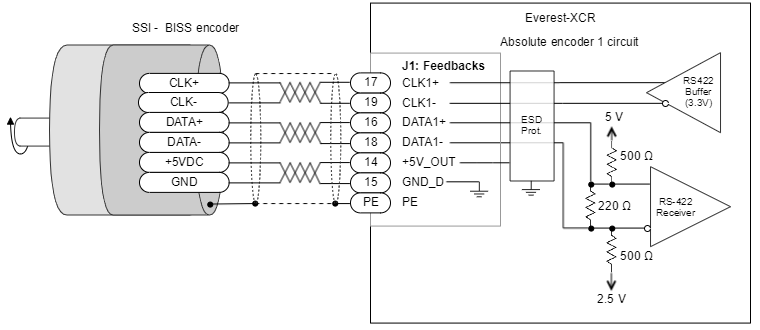 Next Figure shows how to connect a single SSI or BISS-C absolute encoder to the Everest XCR servo drive.