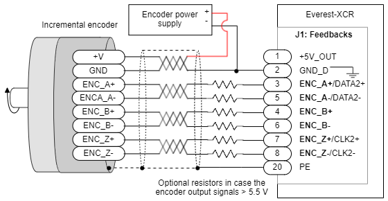 In the case that the encoder has a current consumption higher than 200 mA (maximum current output of the +5V_OUT pin of the Everest XCR) or that the encoder has an input supply > 5V, an external power supply will need to be used in order to power the encoder and in this case some wiring changes need to be taken into account (this applies to both the differential and single-ended encoders, both incremental and absolute):