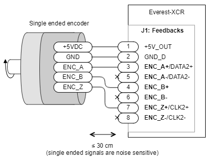 The wiring of a single-ended encoder to the Everest XCR is shown next: