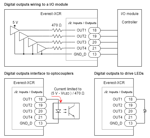 Everest XCR Servo Drive has 4 non-isolated digital outputs. These outputs can be used to drive optocouplers, LEDs or other digital circuits.