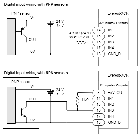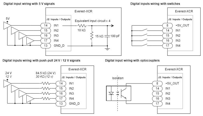 Next figure shows an example of how to wire digital inputs with various input options. For higher voltage systems like 12 V or 24 V a series resistance should be connected to the input.