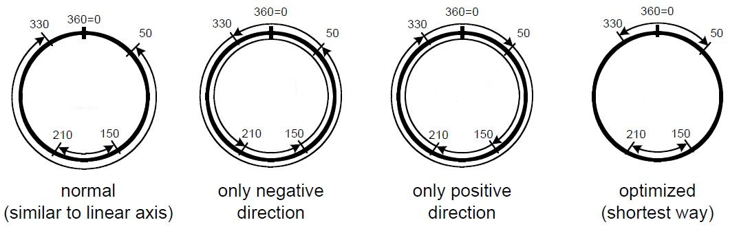Following figure shows examples of the different position option movement types. In this example, the min position range limit is 0° and the max position range limit is 360°.