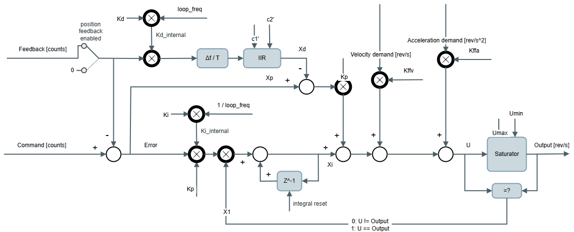 Derivative incorporates also a derivative IIR filter, where c1 and c2 are the derivative filter coefficients:We don't have a way to export this macro.We don't have a way to export this macro.We don't have a way to export this macro.We don't have a way to export this macro.T is the control loop period, in [s], and